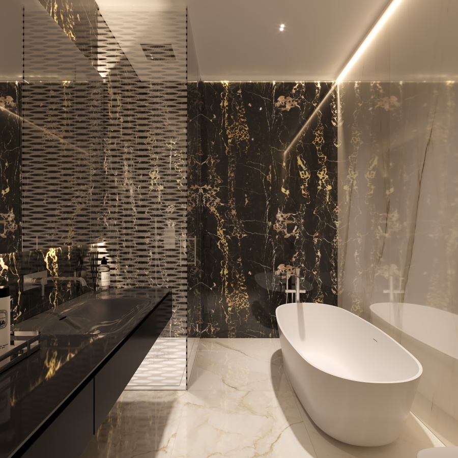 Bathrooms Marble flooring and skirting Marble / wallpaper walls Moisture resistant gypsum ceiling finished with paint Marble counter top Lacquered / Veneer joinery Gessi, Newform or equivalent sanitary fixtures Kohler, Duravit, Geberit or equivalent sanitaryware