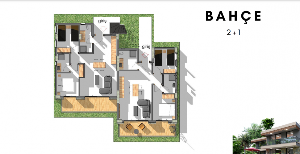 Garden flats; 2+1 has the same dimensions and garden usage areas vary between 150 and 320 m2.