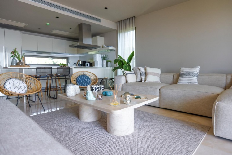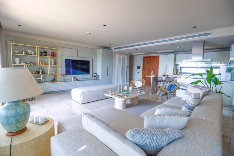 A large terrace with sea views and a comfortable living space integrating both the interior and exterior spaces.