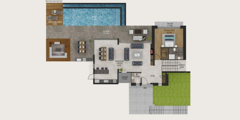 The internal areas of the villas vary from 345 to 355 m2.