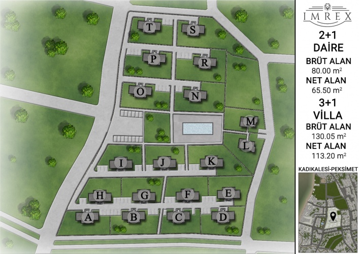 68 units of 2+1 RESIDENCES 2 bedroom + livingroom + 2 bathroom + kitchen + balcony & terrace 80 sqm gross , 70 sqm net property size Upstairs has no garden use , downstair units has the garden use of the area Total land size 22.500 sqm ,