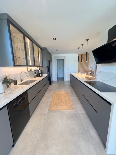 Porcelain kitchen countertops, lacquered kitchen and bathroom cabinets