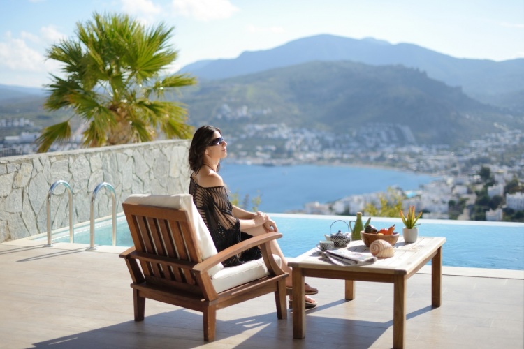 Вилла с видом на море и ландшафтными садами, окружающими пейзажный частный бассейн.